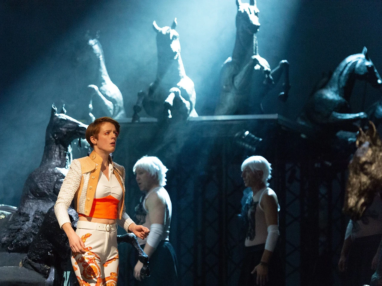 "Estonian designer Madis Nurms fills the almost empty Mainz stage with fantastic costumes: out of the skulls of macho king Tamasse and his relatives grow ram horns decorated with pearls and gold – as a sign of ruthless authority. Zanaida and her followers, on the other hand, carry a third eye on their foreheads, which represents the way to intuition, wisdom and knowledge"