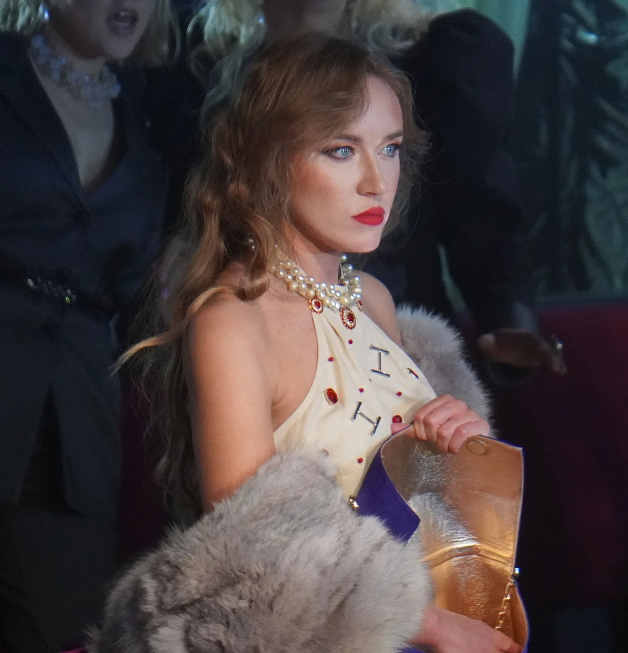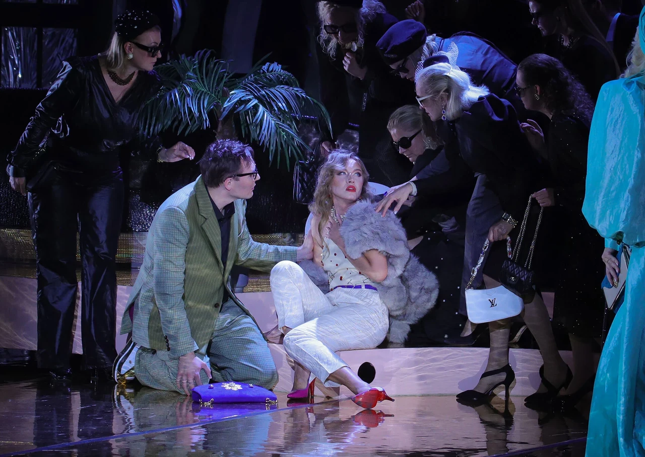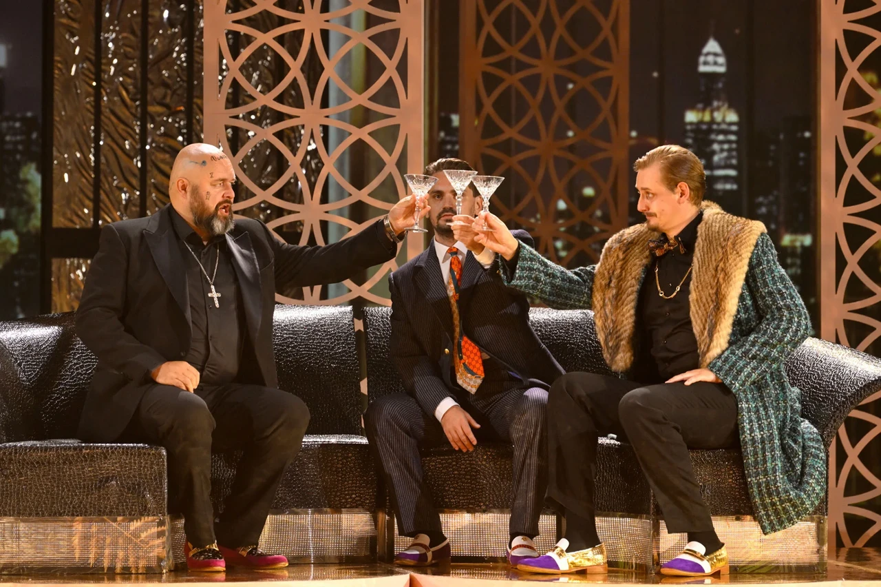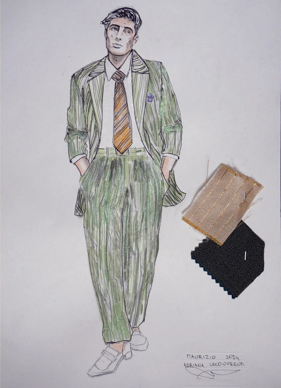 The design aesthetic leans into luxury and excess, balancing structured tailoring with shimmering gowns to evoke an era where ambition, glamour, and appearances ruled supreme. Costume details include power footwear - high heels and loafers in bold purple tones, gold accents, and crocodile textures.