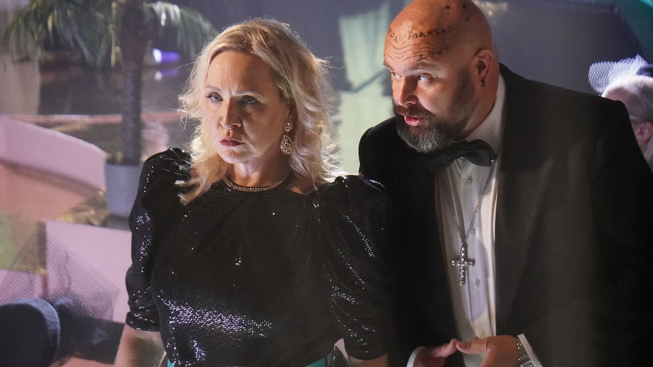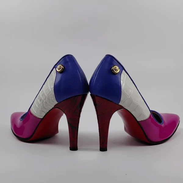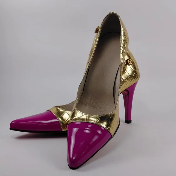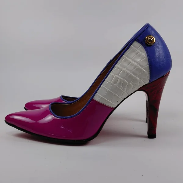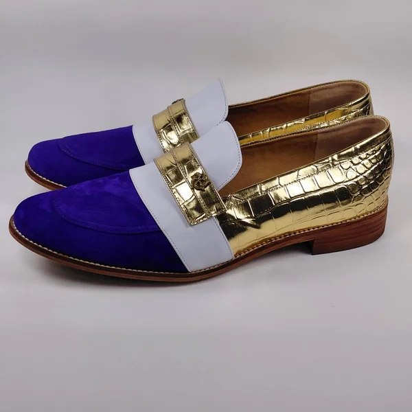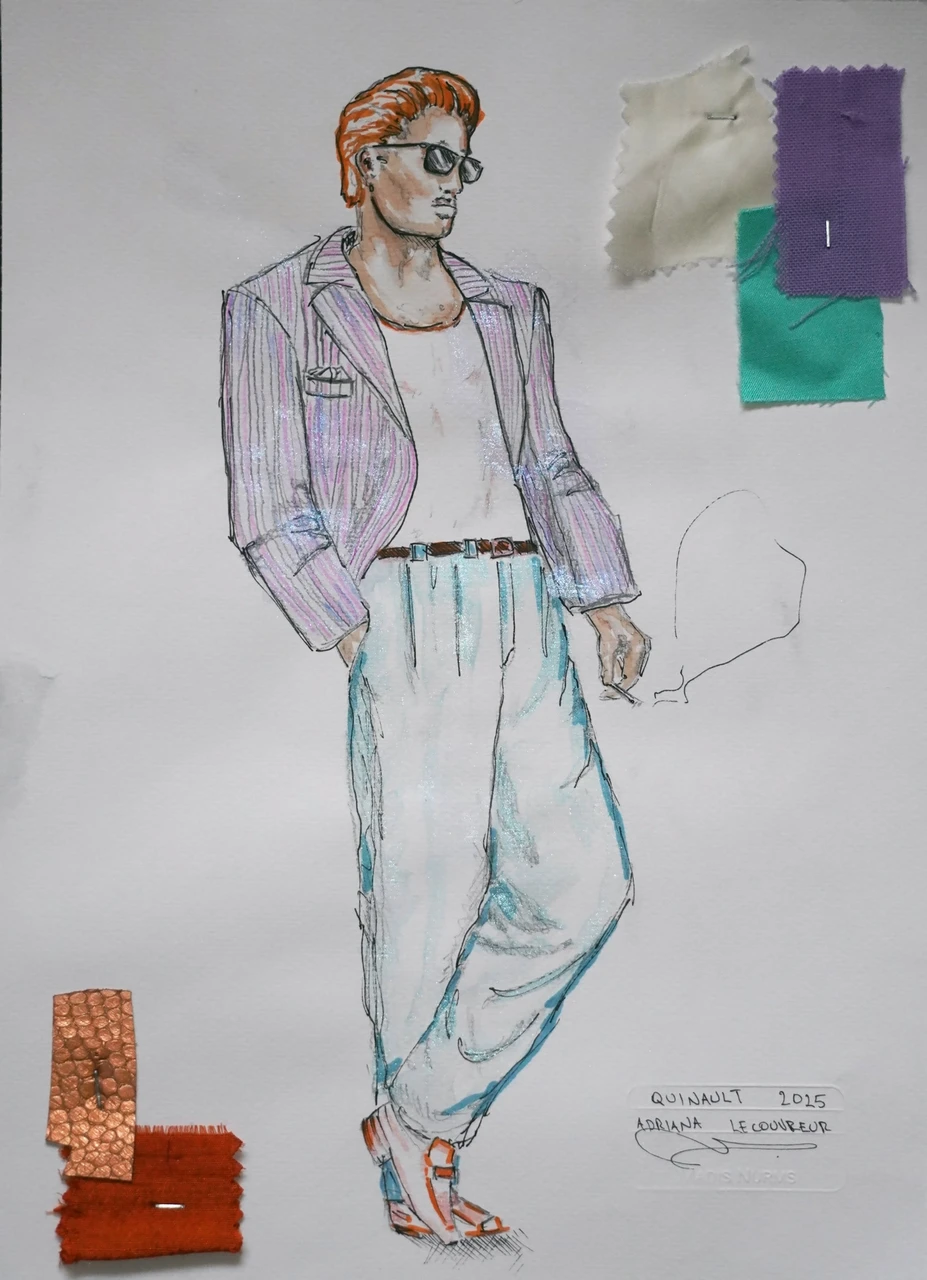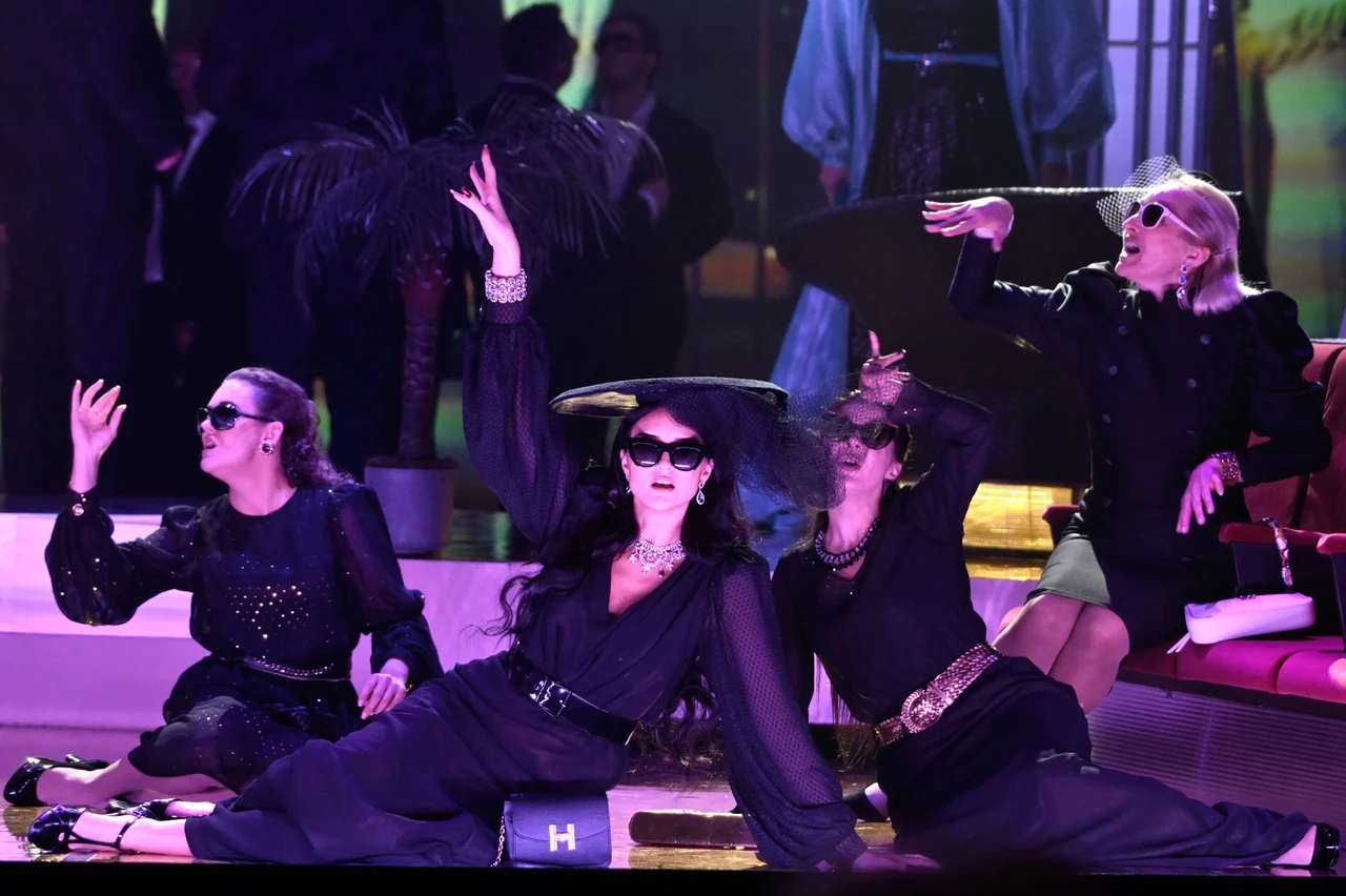 The design aesthetic leans into luxury and excess, balancing structured tailoring with shimmering gowns to evoke an era where ambition, glamour, and appearances ruled supreme. Costume details include power footwear - high heels and loafers in bold purple tones, gold accents, and crocodile textures.
